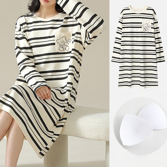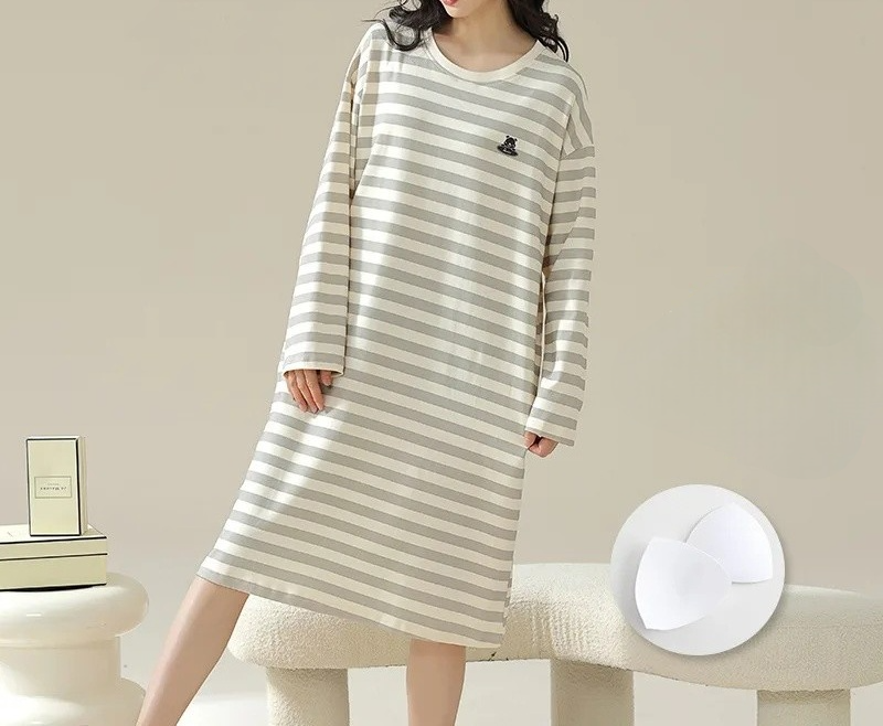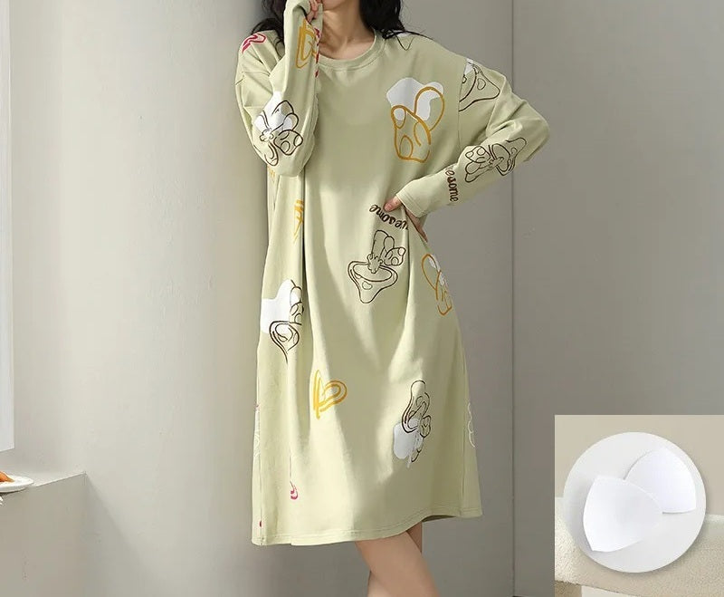 Long Sleeve Nightie with Inbuilt Chest Pads Cute Designs Cotton Plus size available