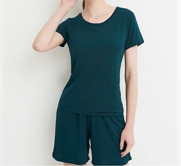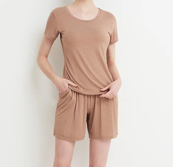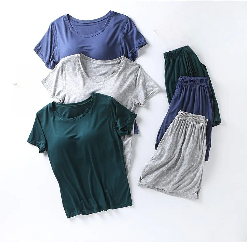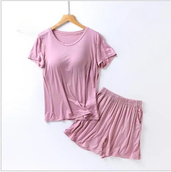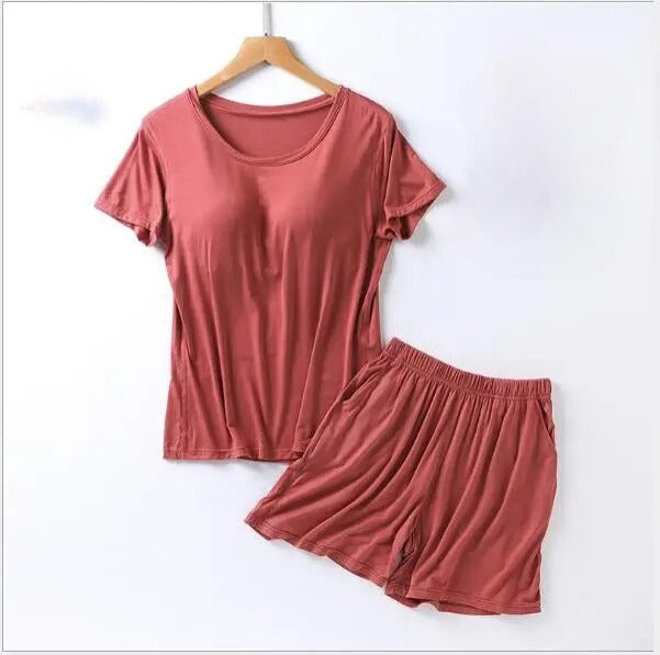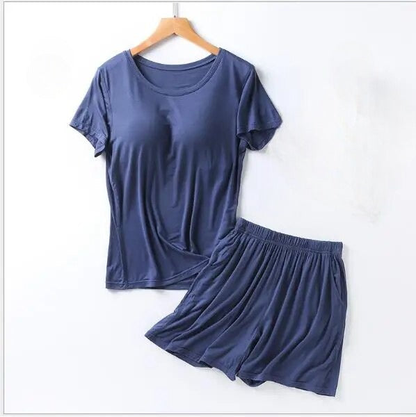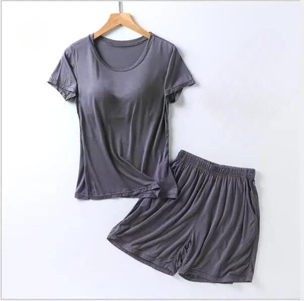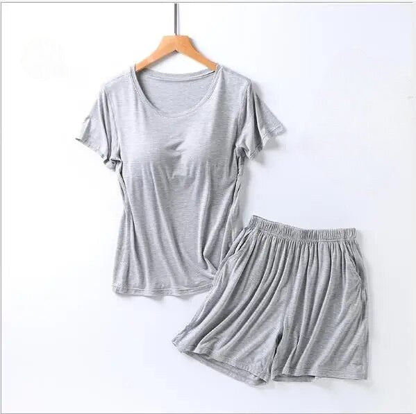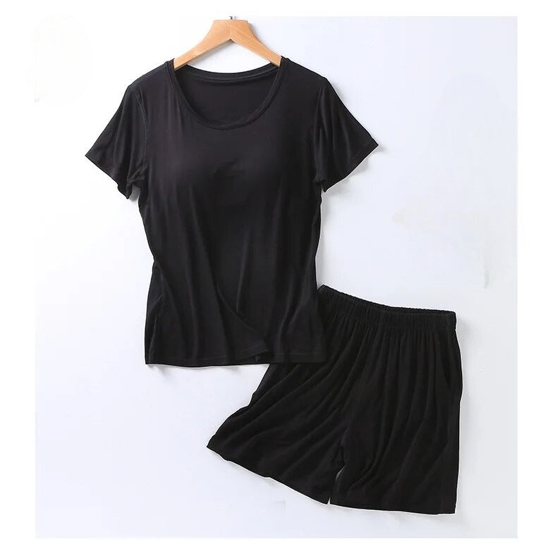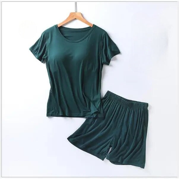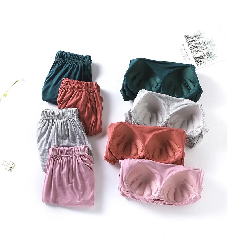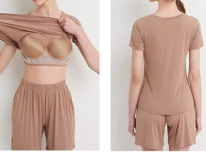 Stylish Design: Elevate your loungewear with a chic and modern design. The set includes a comfortable top with a built-in bra and matching bottoms, creating a coordinated and fashionable look that's perfect for bedtime or casual wear.