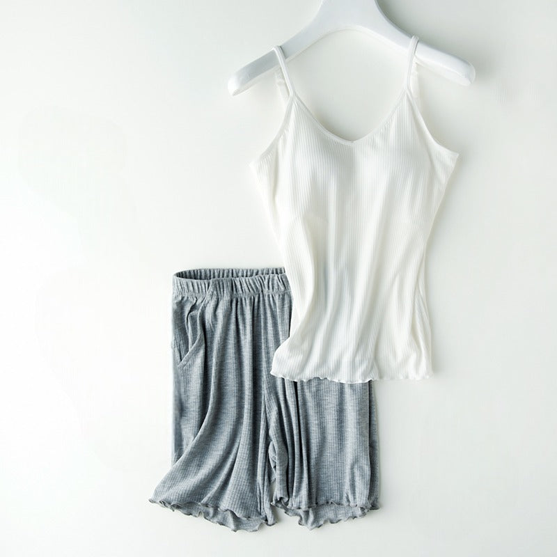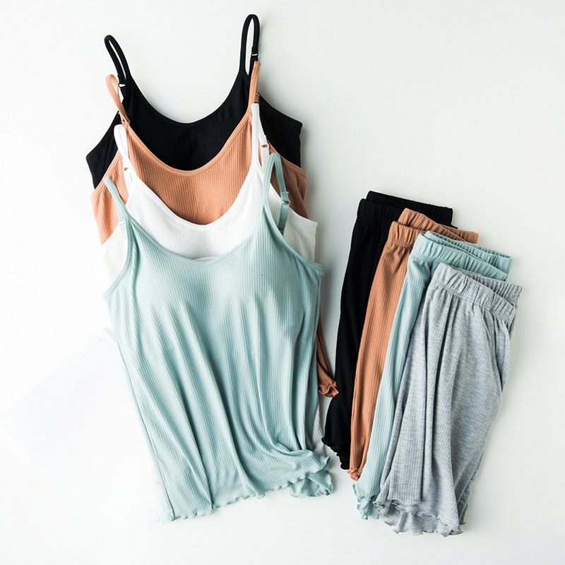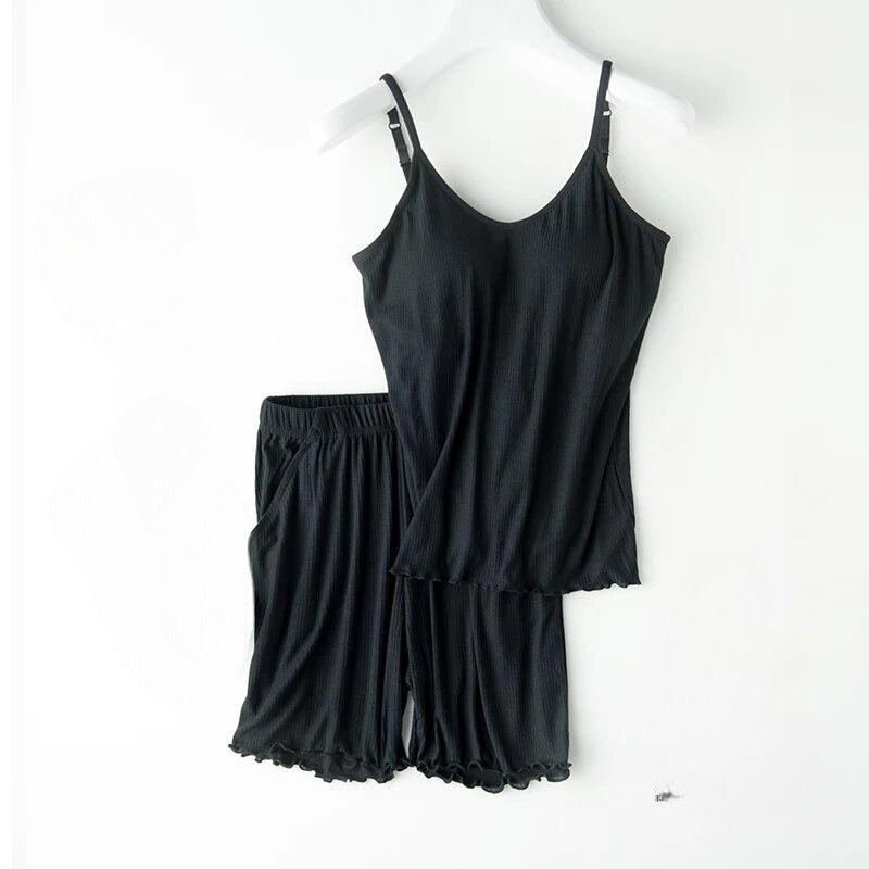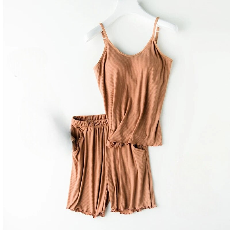 Singlet with Matching Shorts: Elevate your loungewear with our chic and contemporary design. Featuring a snug top with a built-in bra and matching bottoms, it offers a coordinated and fashionable ensemble ideal for bedtime or casual wear.